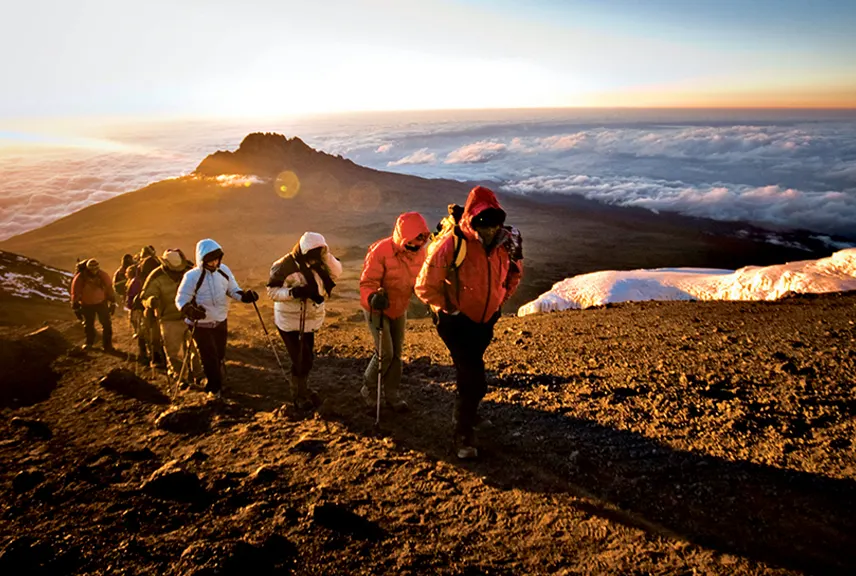 Your summit day begins around midnight, with a challenging ascent under the starlit sky. Following a slow, steady pace, you’ll trek up steep, rocky terrain to reach Stella Point at the crater rim, where you’ll witness a breathtaking sunrise. From there, a final push will take you to Uhuru Peak (5,895m), the highest point in Africa. After celebrating at the summit, you’ll begin the descent back to Barafu Camp for a short rest and breakfast, then continue down to Mweka Camp (3,080m) for a well-deserved night’s sleep.